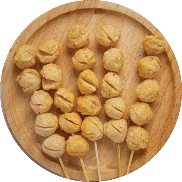 Kepingan bebola ikan goreng garing dengan sos manis pedas khas Thai, rangup di luar, lembut di dalam.